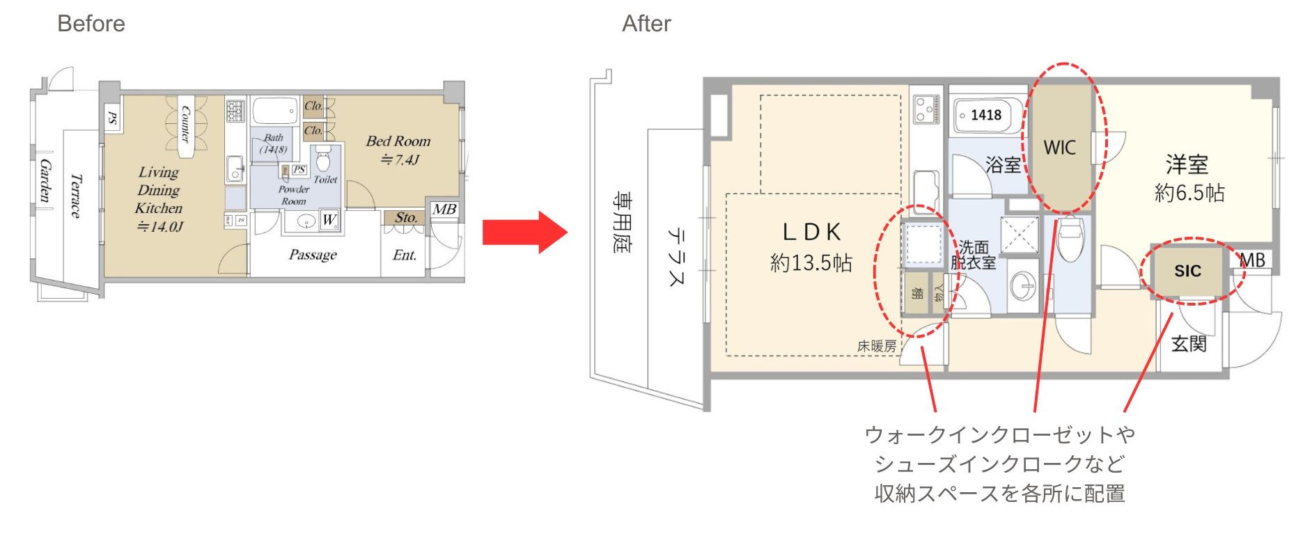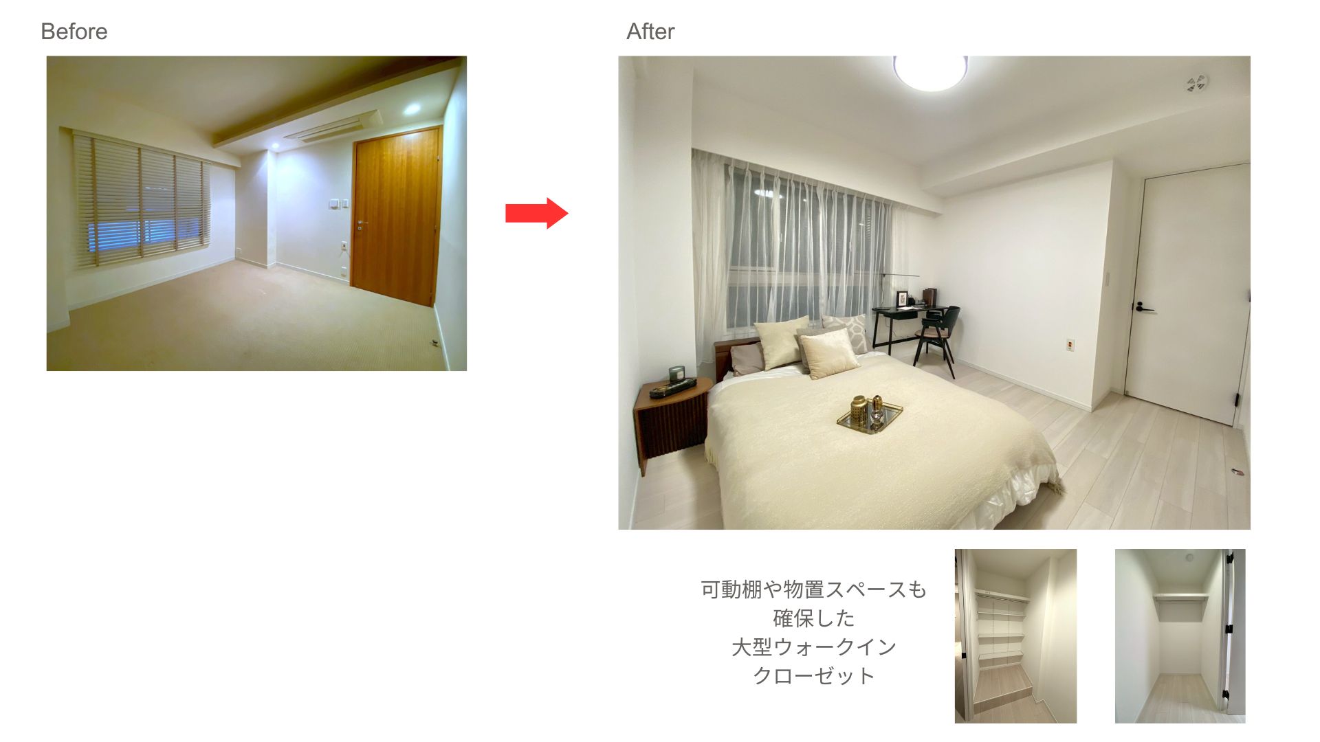 ▼洋室はカーペットをホワイト系フローリングに変更し、収納の扉色を茶系からホワイト系にしました。大型のウォークインクローゼットを設置し、収納力をアップさせました。
