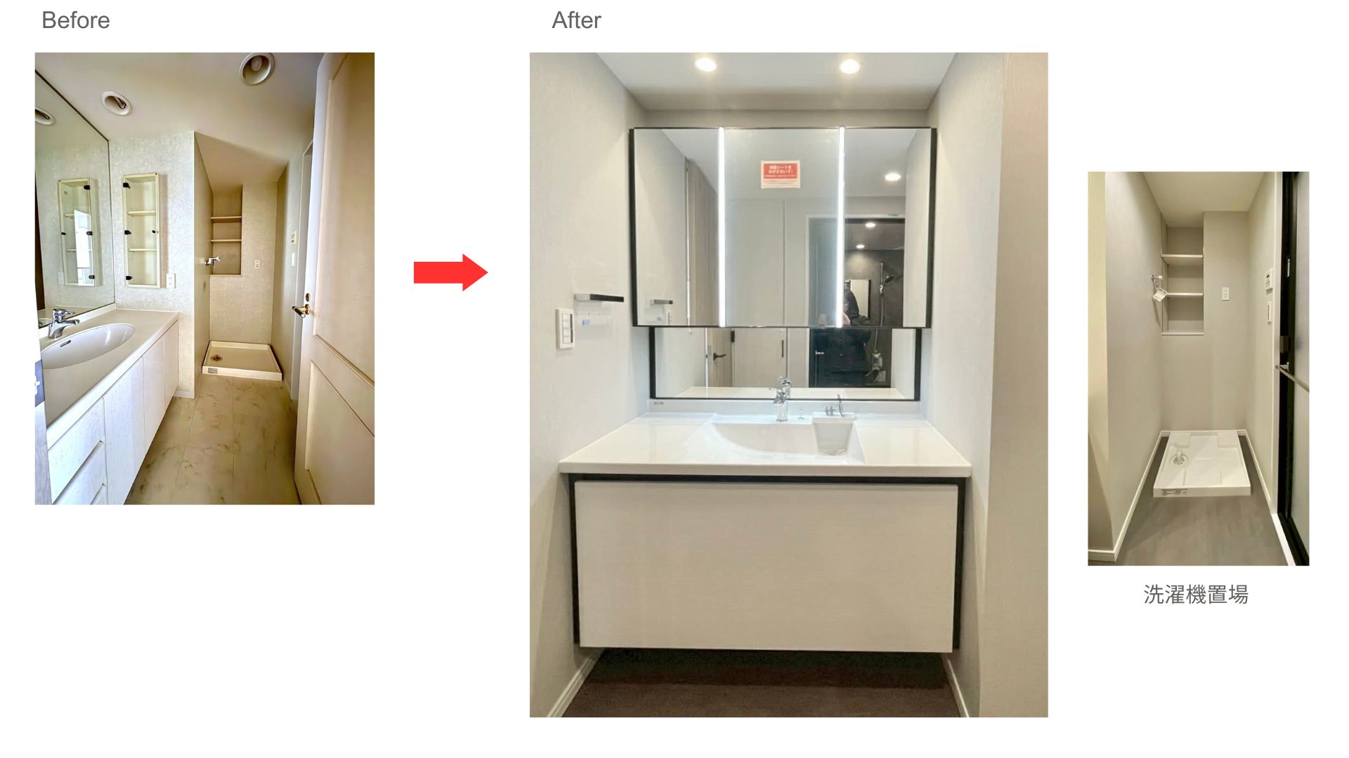 ▼三面鏡にもなる鏡とお手入れしやすい洗面ボウルやお化粧しやすいフルフェイスライトなどが特長の洗面台を設置しました。洗面室のクロス(壁紙)はグレーを採用し、モダンな空間にしました。洗濯機置場の上部棚は残して利便性を維持しました。