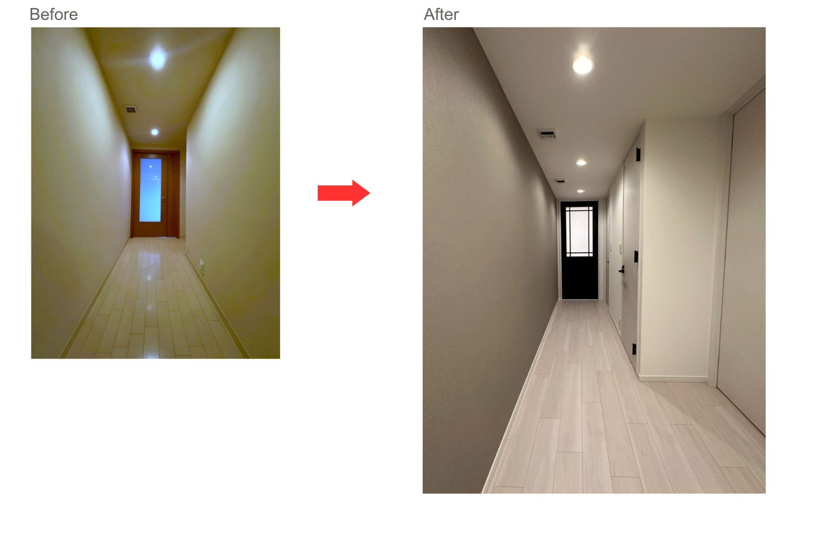 ▼廊下の壁はシックなアクセントカラー、ホワイト系フローリング、奥のリビングに繋がる扉はスタイリッシュなデザインでシックなネイビーカラーにして、廊下全体の色味を引き締めました。