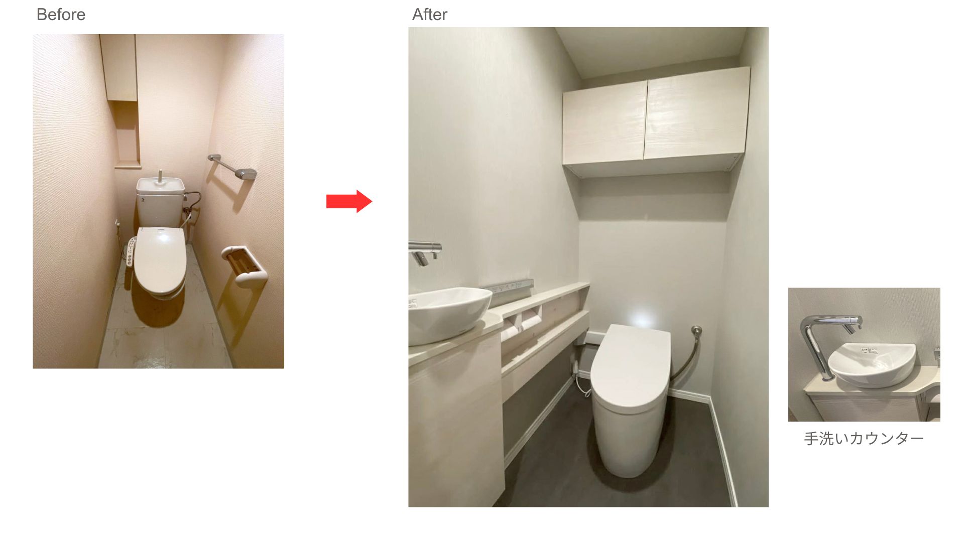 ▼高機能のタンクレストイレに変更して室内をすっきりさせ、上部収納を設置しました。カウンターと手洗いを新設し、リモコンやタオル掛けなどの設備もまとめワンランク上のグレードとしました。