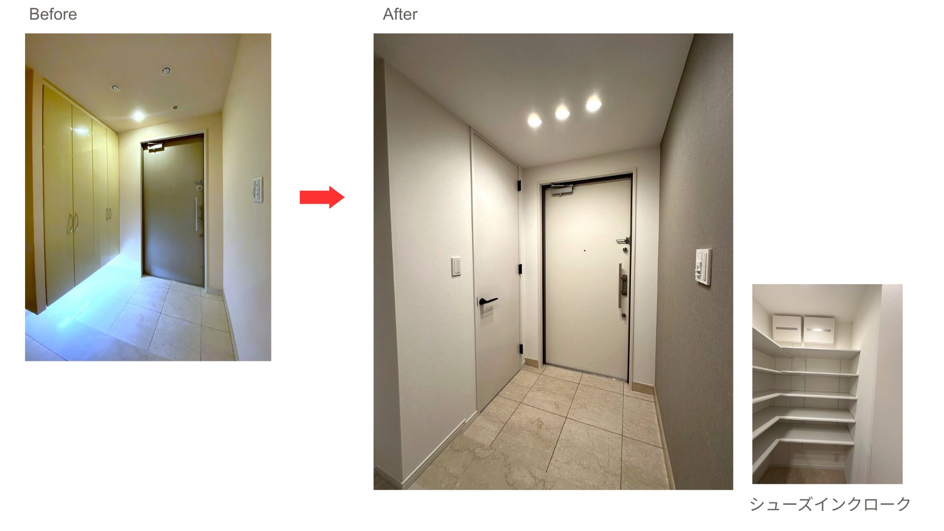 ▼幅広の下足入れをシューズインクロークに変更することで収納量をアップさせながら、ホワイト系でまとめて広々と感じる玄関になりました。