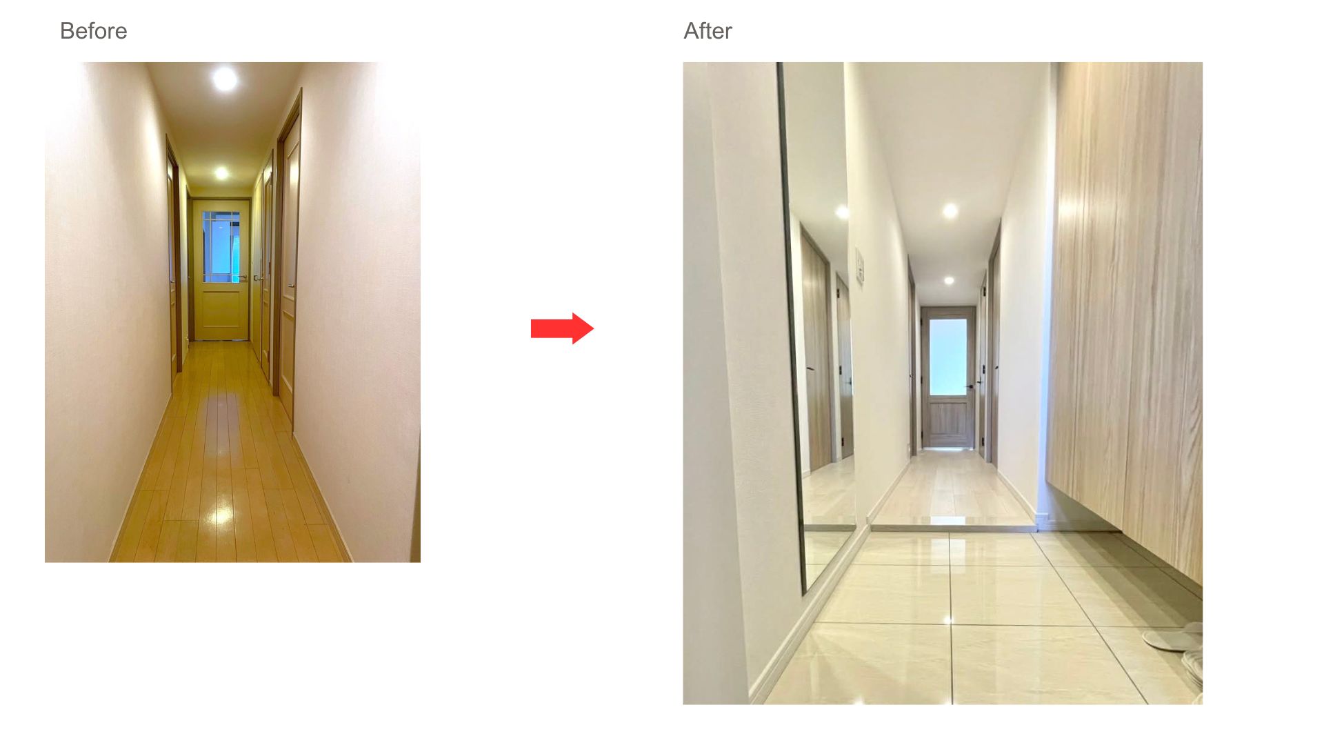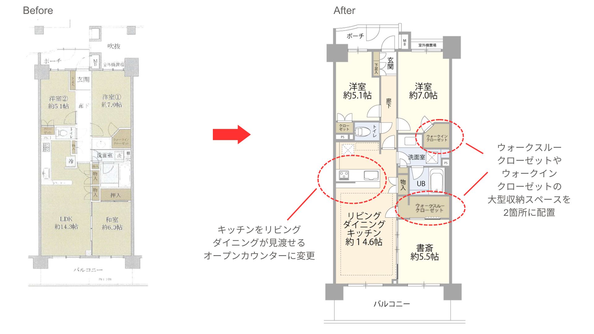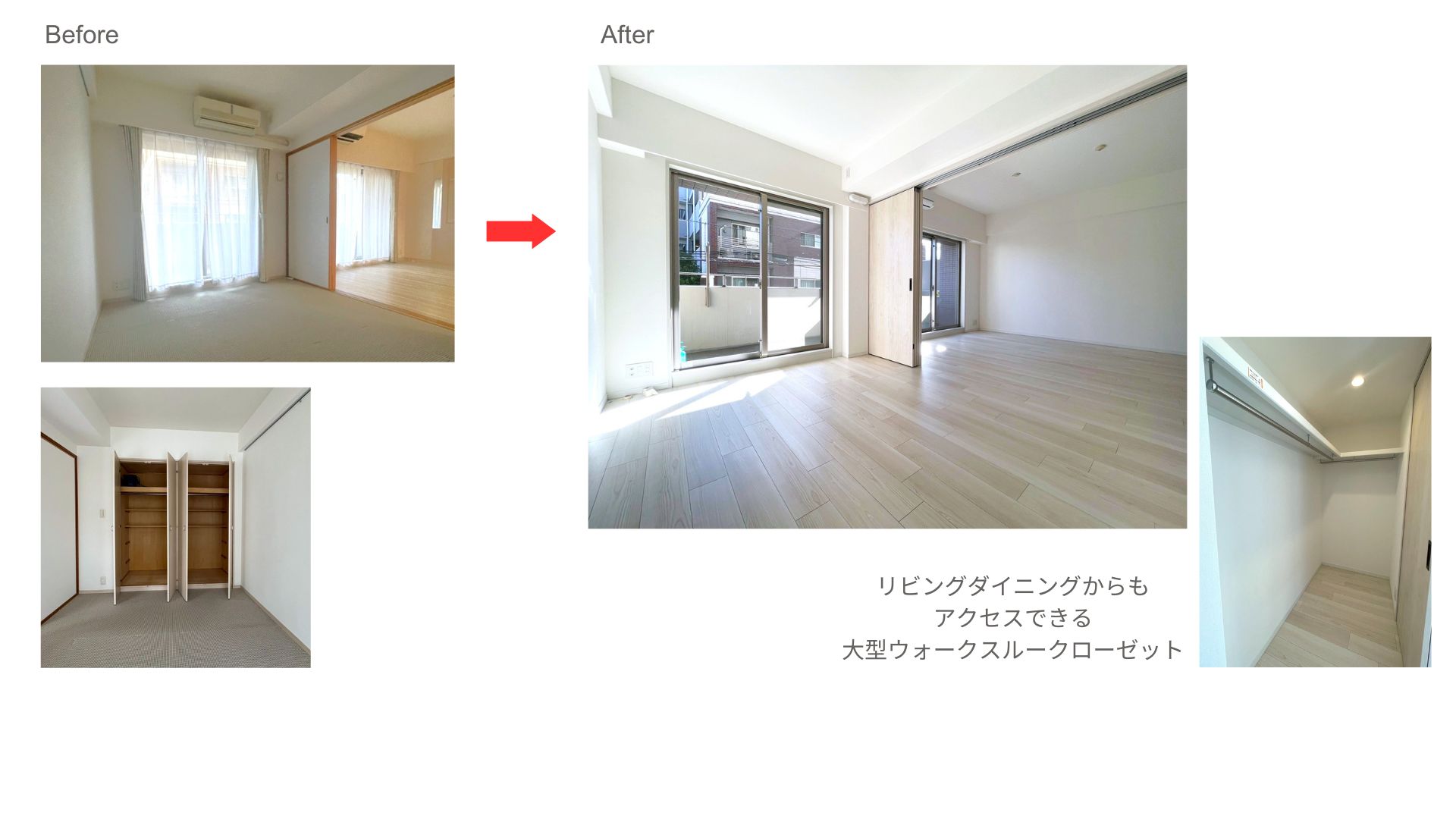 ▼LDの横にあった和室を洋室に変更しました。床の仕切りもなくすことでリビングとの一体感を実現しました。クローゼットはリビングダイニングからもアクセスできる大型のウォークスルータイプに変更し、収納量も大幅にアップさせました。