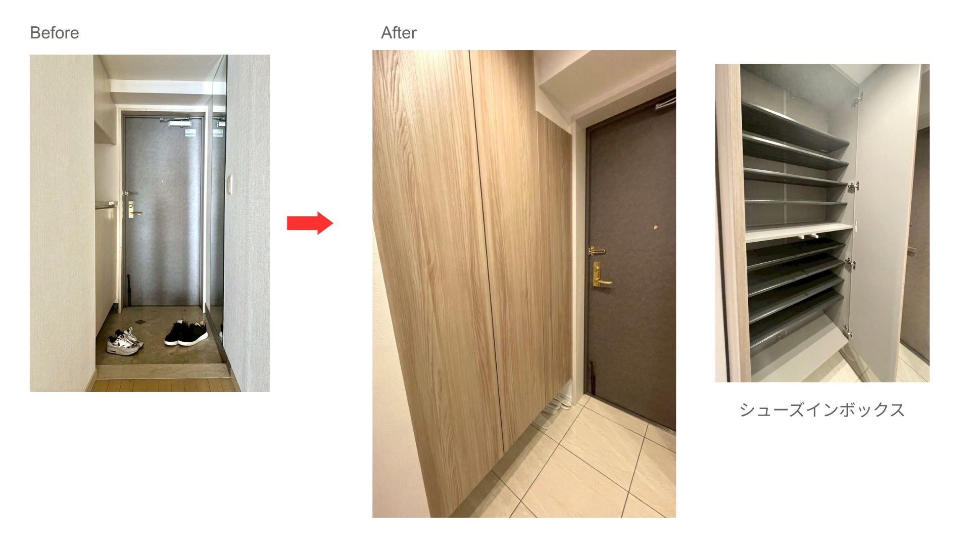 ▼玄関床は明るい色のお手入れしやすい大理石調タイルを敷き、シューズクロークは天井高までの大型タイプにしました。