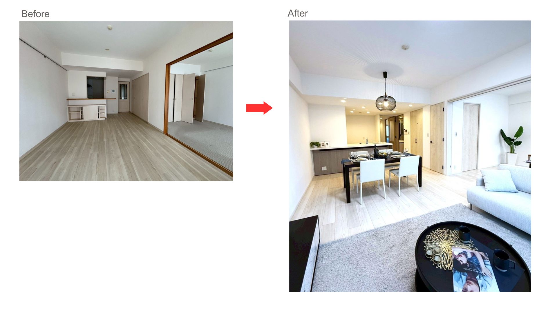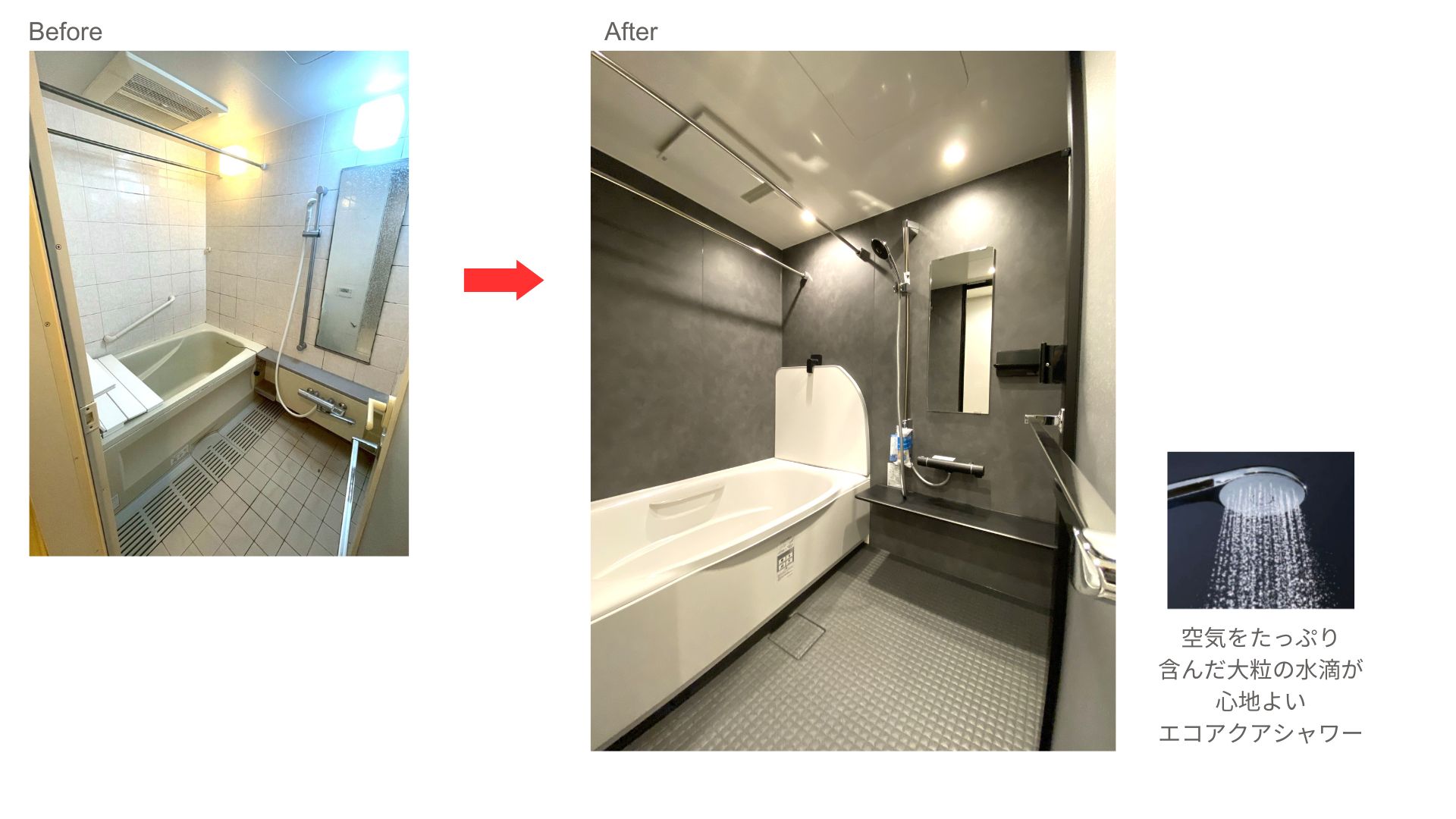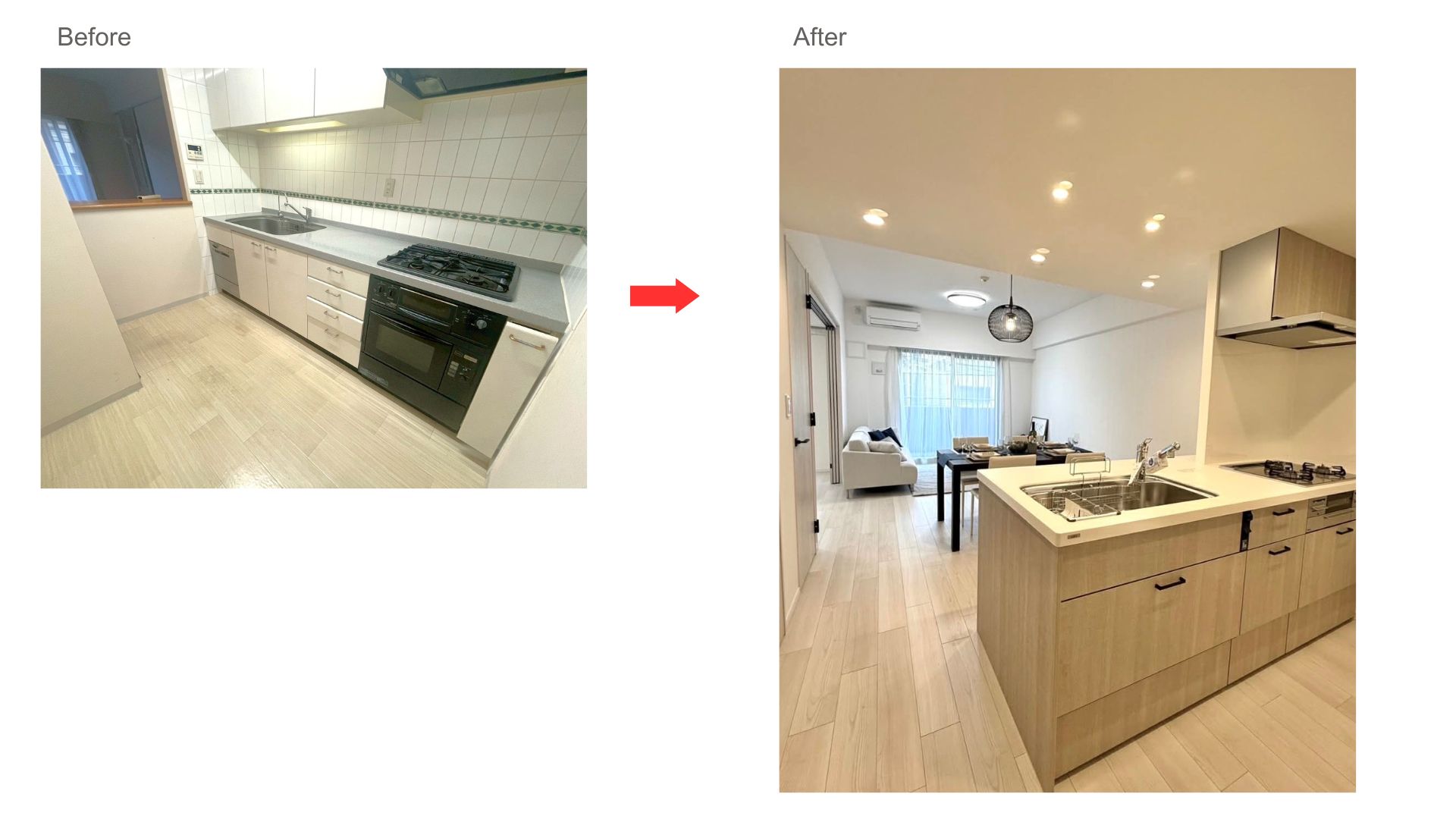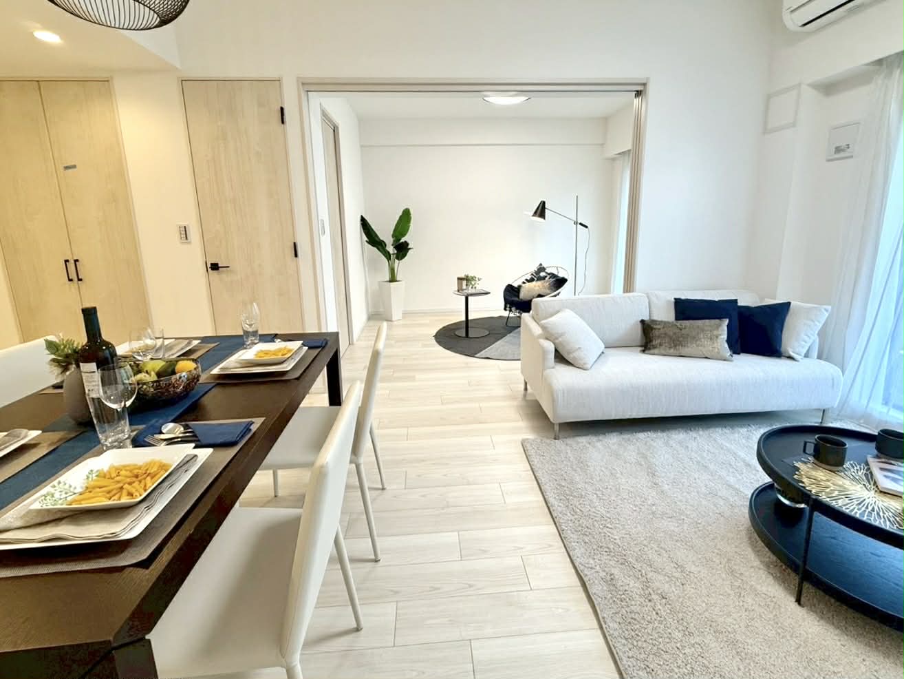 ■部位:一部間取り変更、全室フローリング及び水回り床貼替、全クロス貼替(壁・天井)、各室扉交換、巾木新規、新規キッチン交換、新規ユニットバス交換、浴室乾燥機交換、洗面化粧台交換、温水洗浄便器交換、給湯器交換、コンセントフェイスおよびスイッチフェイス交換、換気口交換、照明球LED全交換(白熱色)、エアコン新規(LD)等