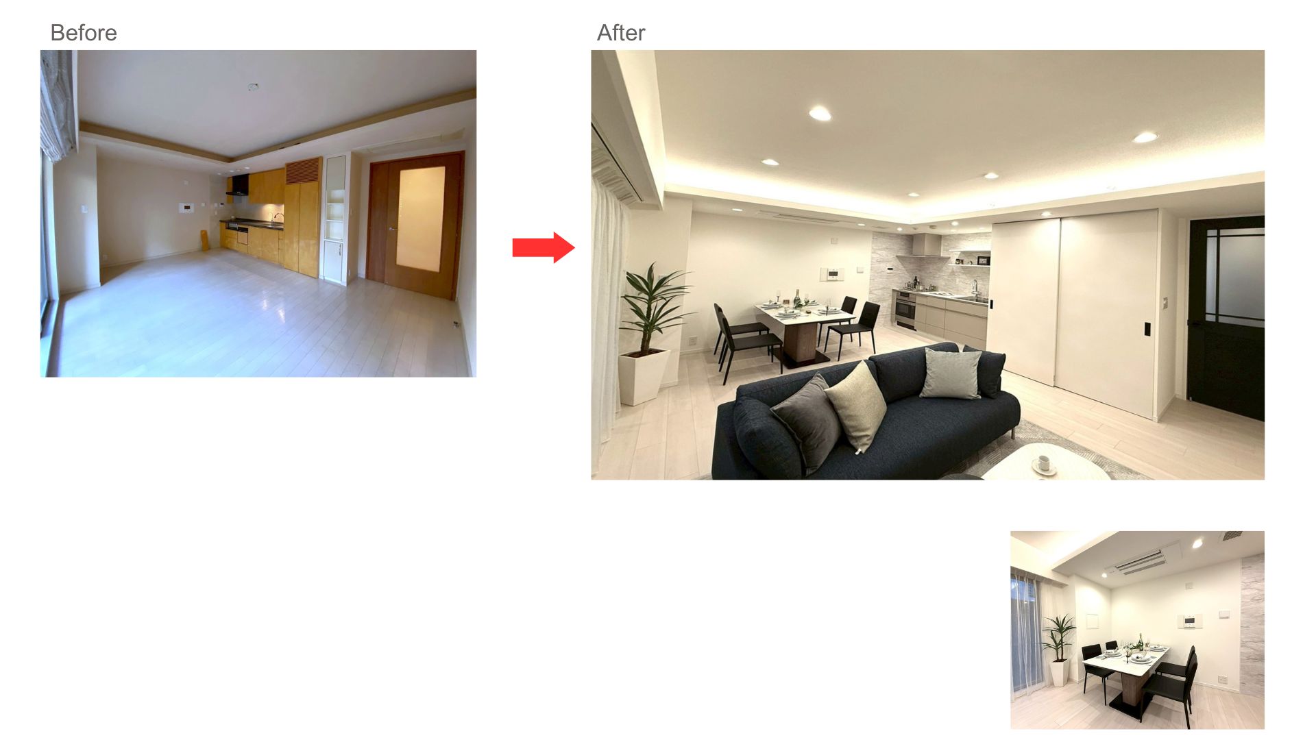 ■部位:全室フローリング及び水回り床貼替、全クロス貼替(壁・天井)、各室扉交換、巾木新規、新規キッチン交換、新規ユニットバス交換、浴室乾燥機交換、洗面化粧台交換、給湯器交換、温水洗浄便器交換、コンセントフェイスおよびスイッチフェイス交換、換気口交換、照明球LED全交換(白熱色)、エアコン新規(LD、洋室)等
