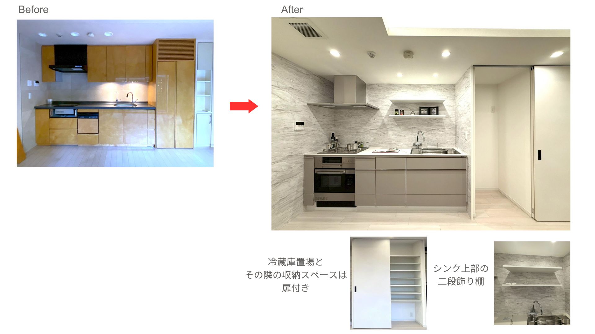 ▼キッチンエリアはスタイリッシュな壁紙を施し、吊戸棚を撤去して飾り棚に変え、レンジフードはマントルフードに変更し、すっきりとした印象にしました。
