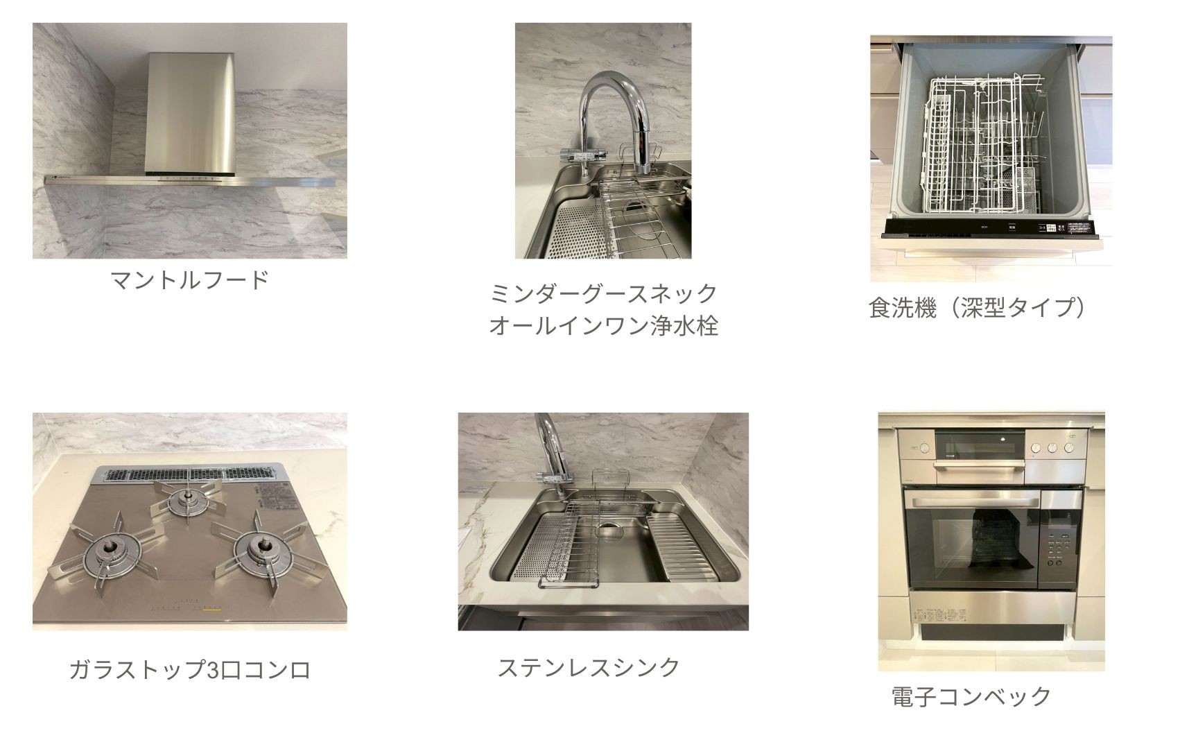 ▼キッチン設備は、マントルフード、電子コンベック、ガラストップ3口コンロ、ミンダーグースネックオールインワン浄水器、ビルトイン食洗機などで充実させました。