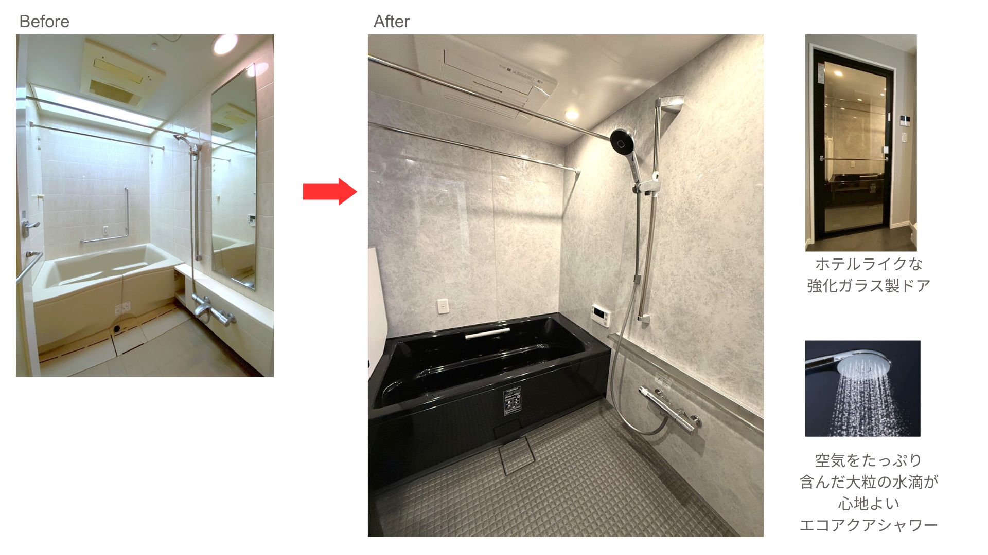 ▼1418サイズの浴室は、全体的にブラックやメタル調の落ち着きのある空間にしました。ストレートラインの浴槽やエコアクアシャワー、シャワーの高さを調整して頭からシャワーを浴びることの出来るフルフォールスライドバー、自動追い炊き機能、浴室乾燥機などの設備も充実させました。お手入れし易く足がヒヤッとしないキレイサーモフロアも特長です。