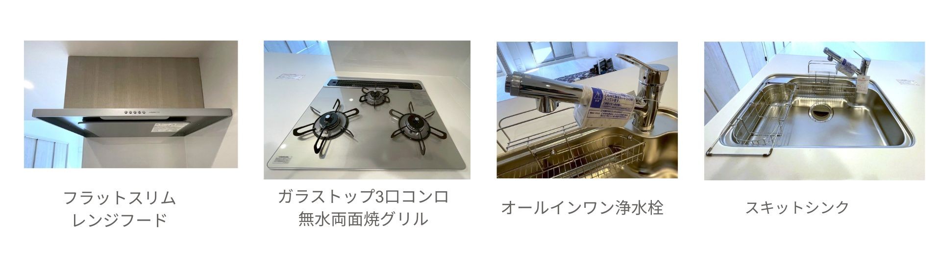 ▼キッチン設備は、薄型レンジフード、無水両面焼グリル付き3口コンロ、オールインワン浄水器、スキットシンクなど、お手入れしやすく使いやすい設備にしました。