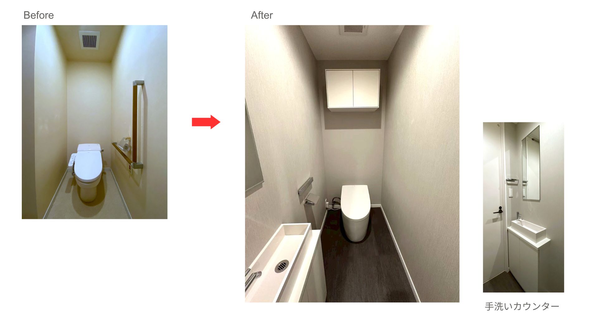 ▼洗面所と同じエリアでオープンに位置していたトイレを独立させました。高機能のタンクレストイレと上部収納を施し、手洗いや鏡を新設しました。