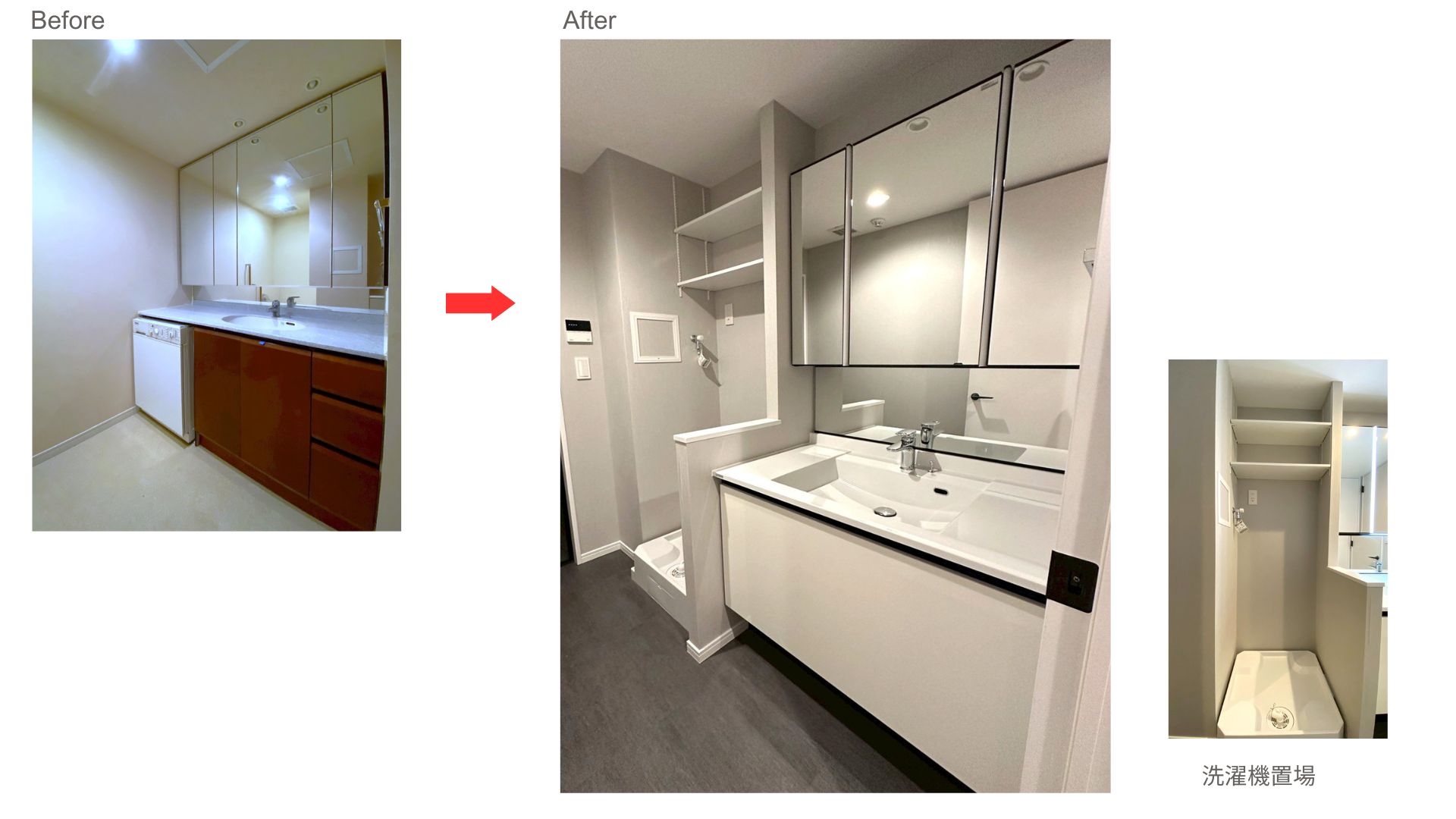 ▼三面鏡にもなる鏡とお手入れしやすい洗面ボウルやお化粧しやすいフルフェイスライトなどが特長の洗面台を設置しました。洗濯機置場に可動式の上部棚を設置して収納量をアップさせました。