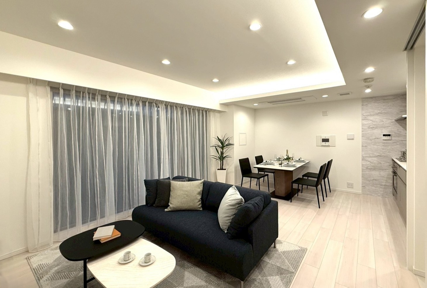 【ダウンライトや光天井の天井照明とビルトインエアコンの設置で、広がりを感じるすっきりとしたリビングダイニング。】